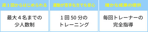 さらに1グループ3名のグループレッスンを実施するため、パーソナルトレーニングに匹敵するパーソナル指導を実現し、それをパーソナルトレーニング1回分程度の「月会費」で提供します。